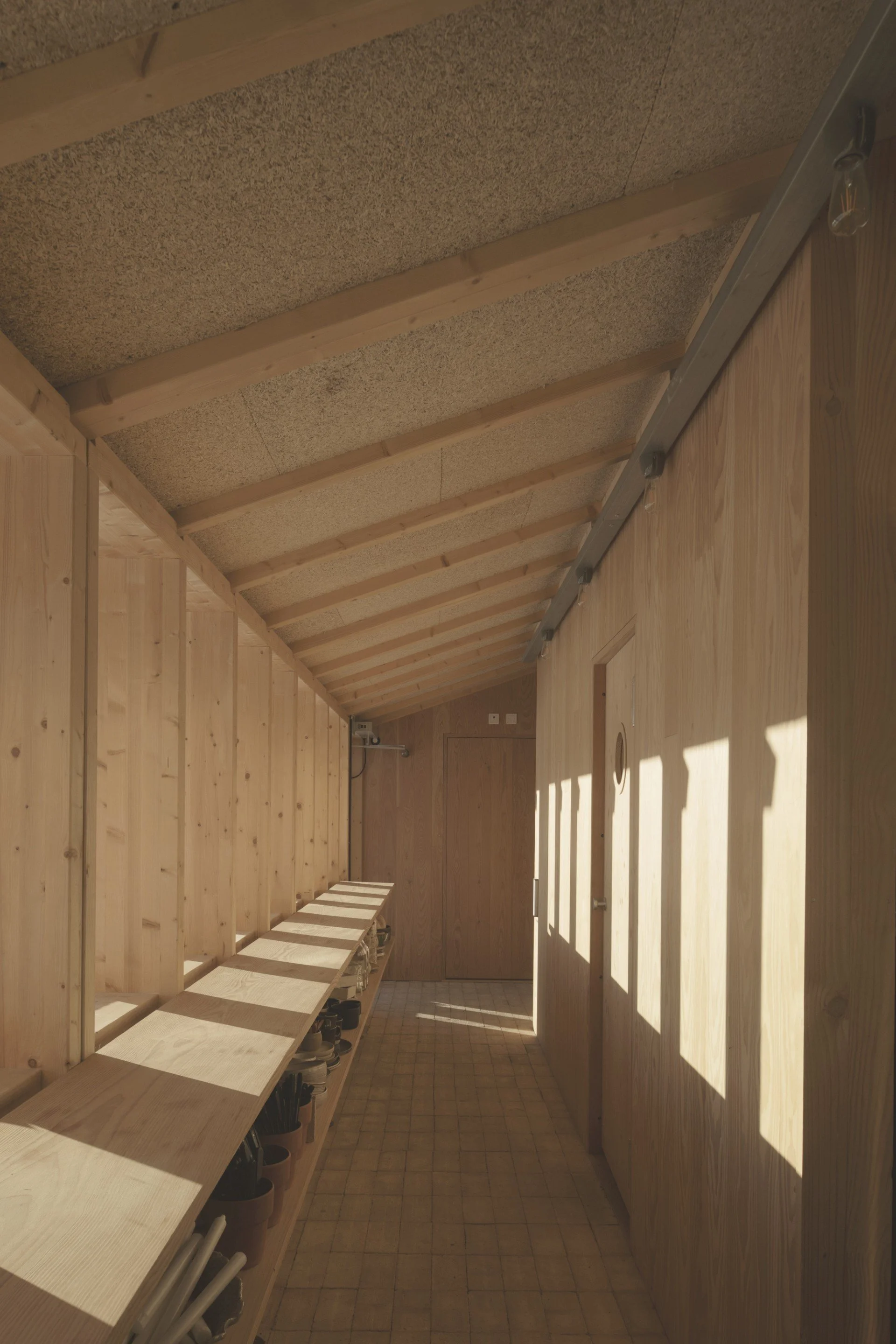 The architecture grew from the same logic as the cultivation and the surrounding life. The studio, the passage structure, and the orangery are restrained in expression and held together by generous roofs that give the ensemble a horizontal gravity. They are not experienced as separate buildings but as parts of a continuous garden room. One moves between them without clear boundaries. Passing through the timber passage, the body slows, movement gathers, and the courtyard opens.