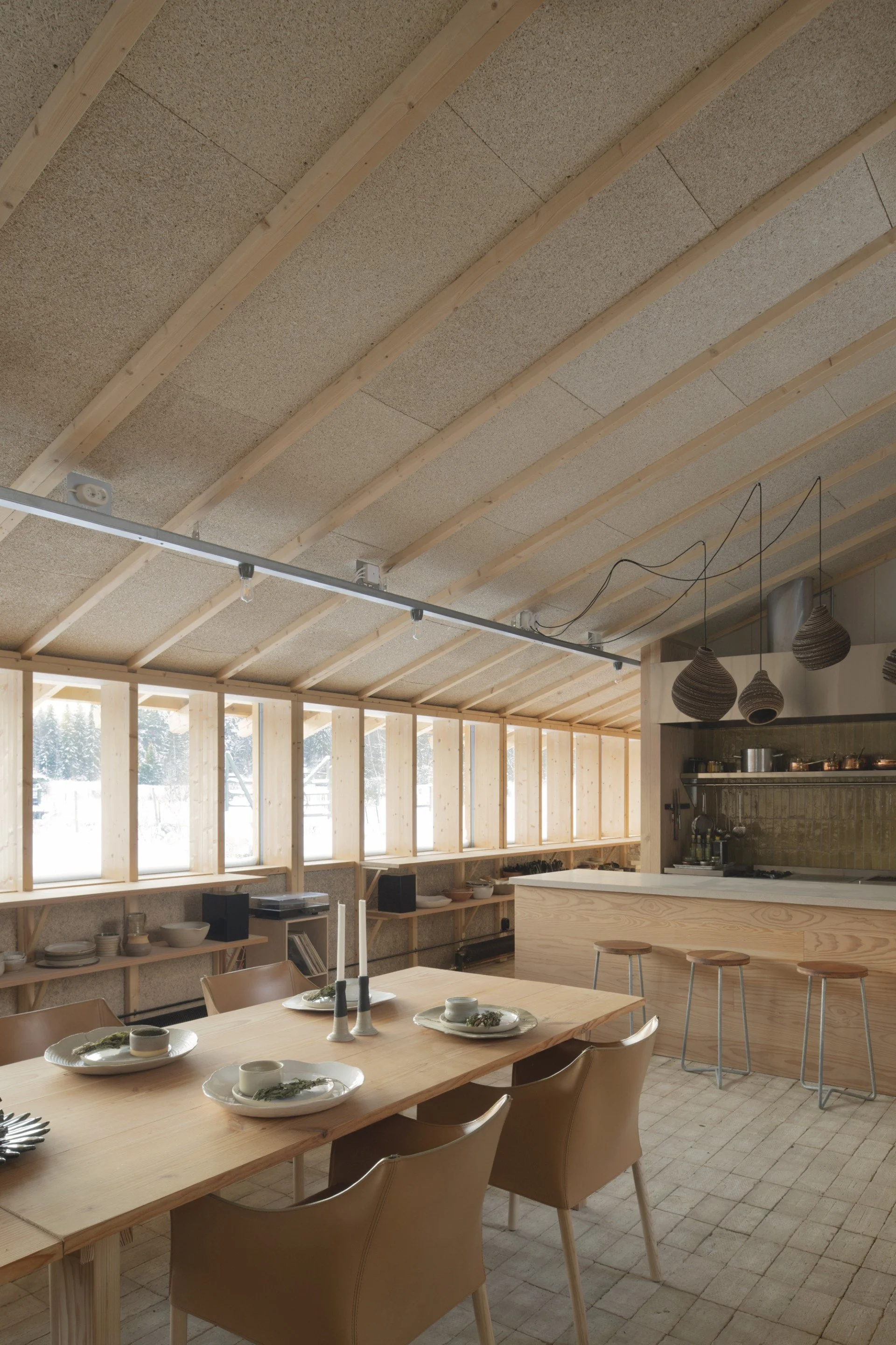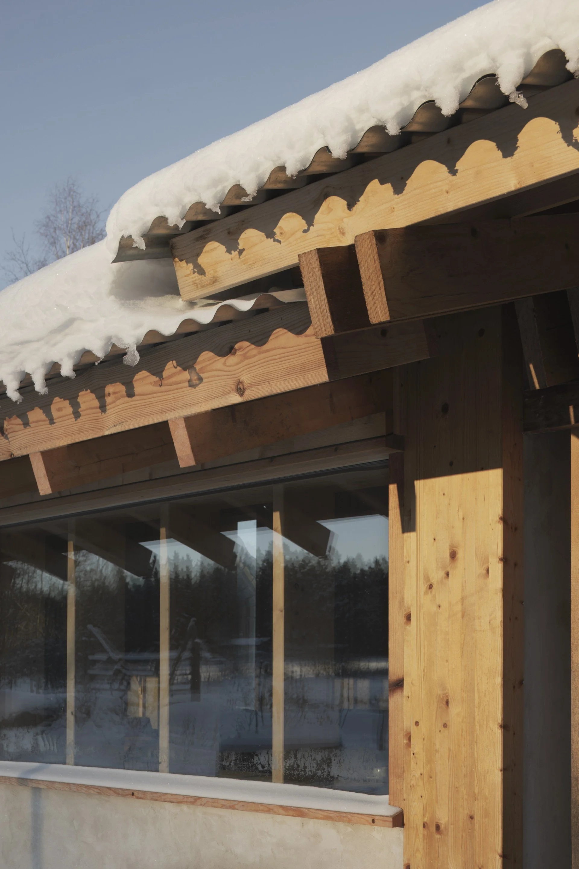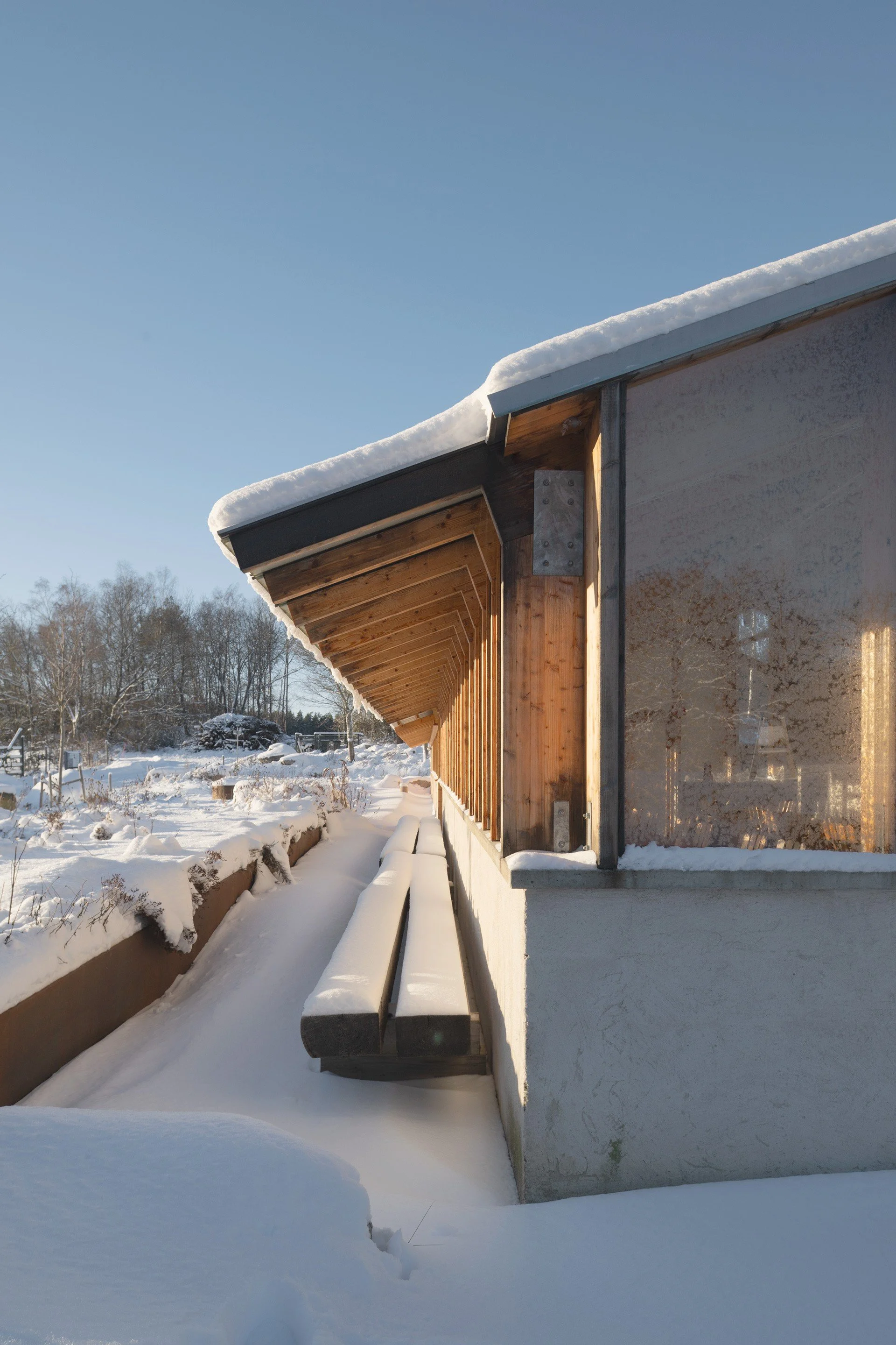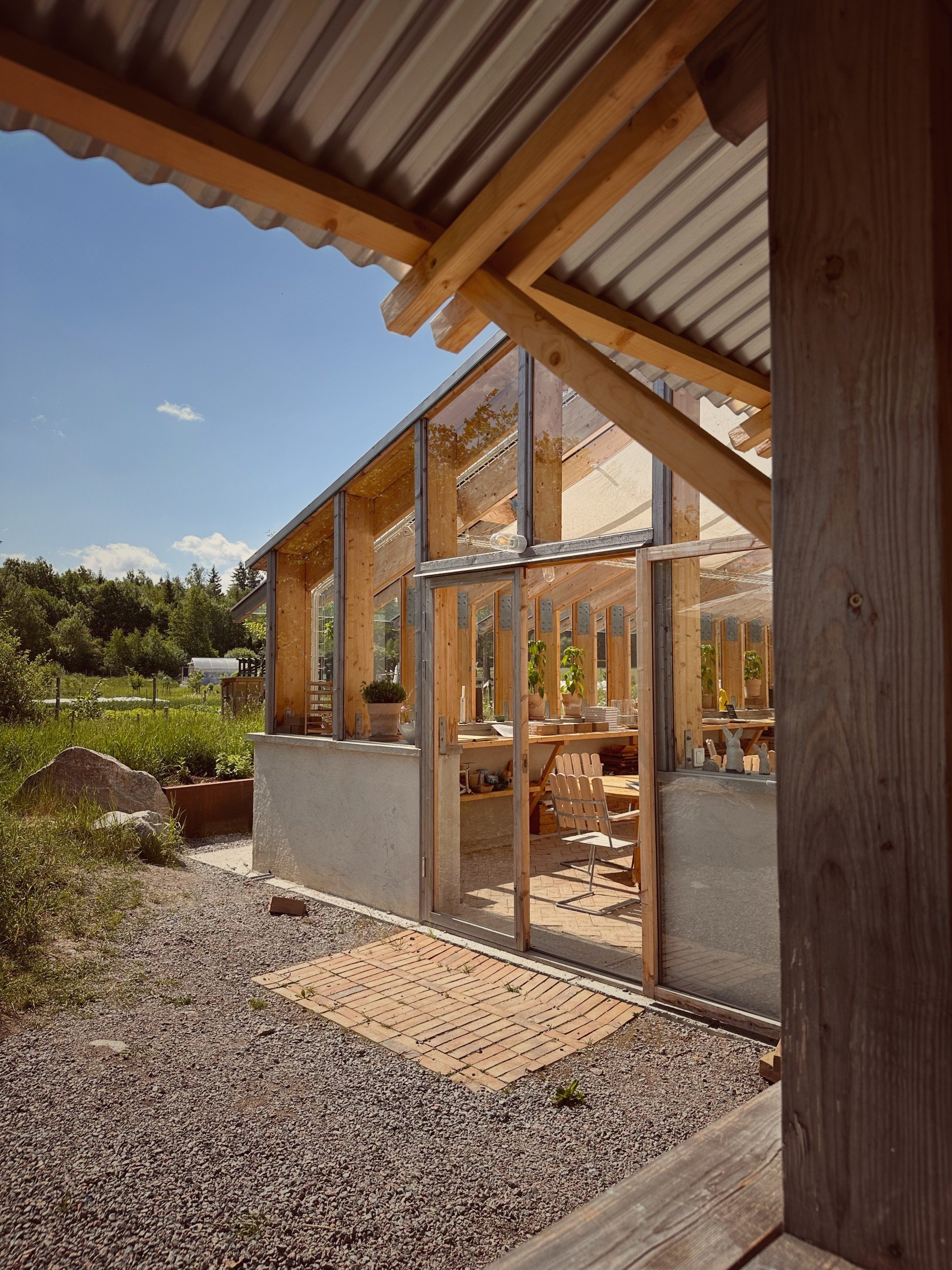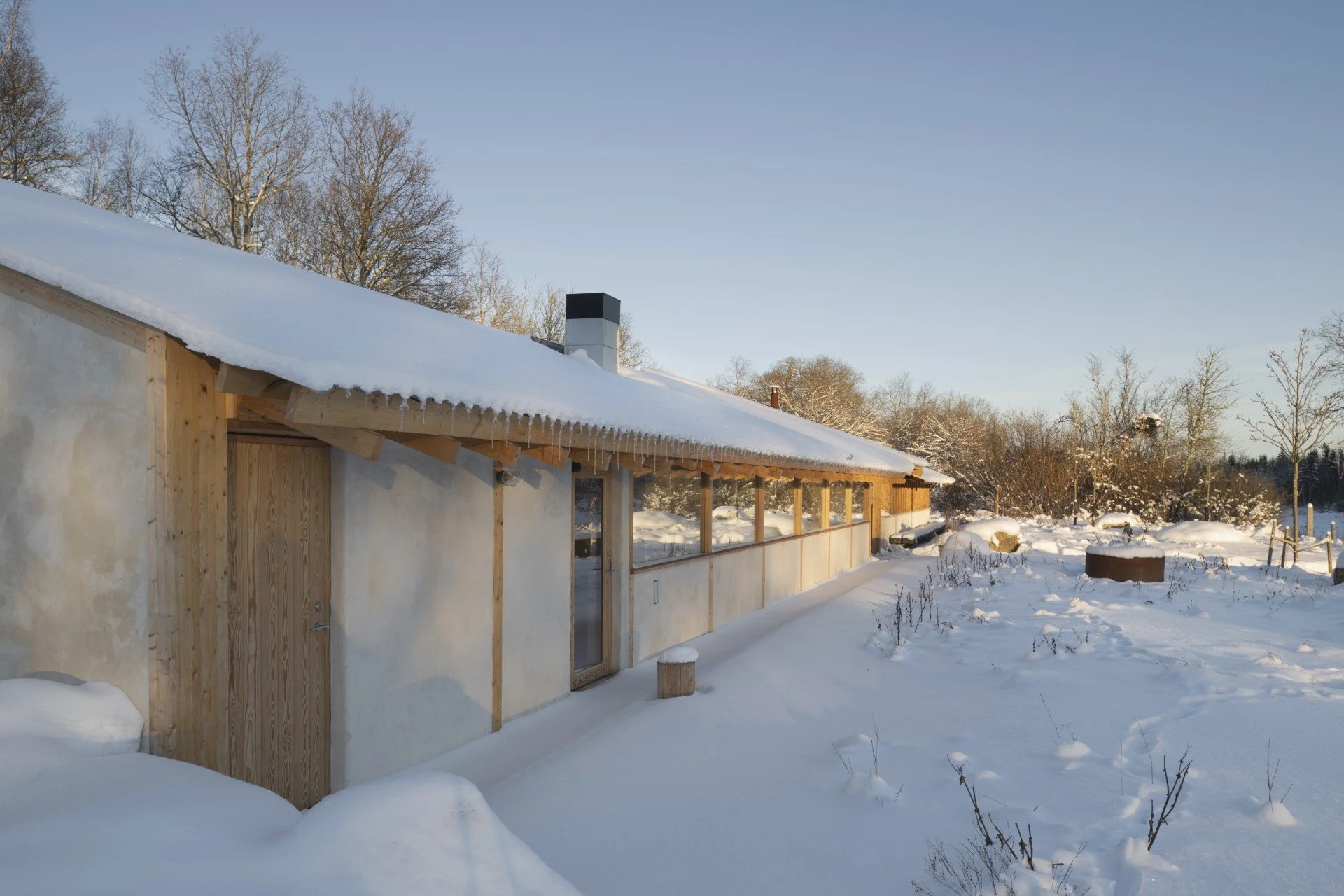 Studion är den bärande volymen, tung och förankrad i marken. Grunden av återvunnet cellglas, limträstommen och väggarna av svenskodlad hampakalk ger huset stadga och långsiktighet. Konstruktionen är direkt och noggrant genomarbetad. Orangeriet är lättare och mer öppet, uppbyggt av en slankare trästruktur och glas som släpper in ljuset från flera håll. Här märks klimatet och årstidernas skiftningar tydligt och påverkar hur rummet används.