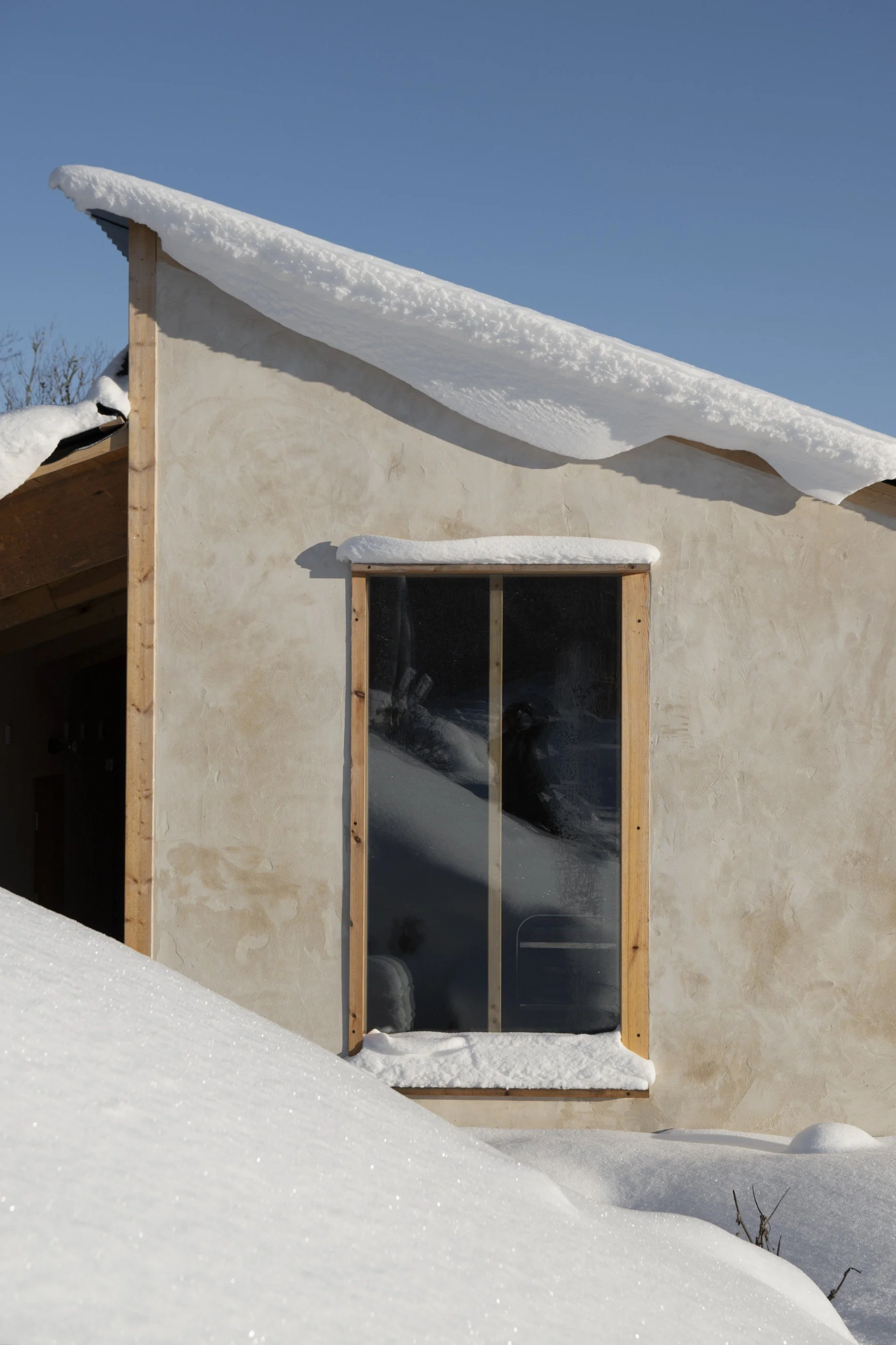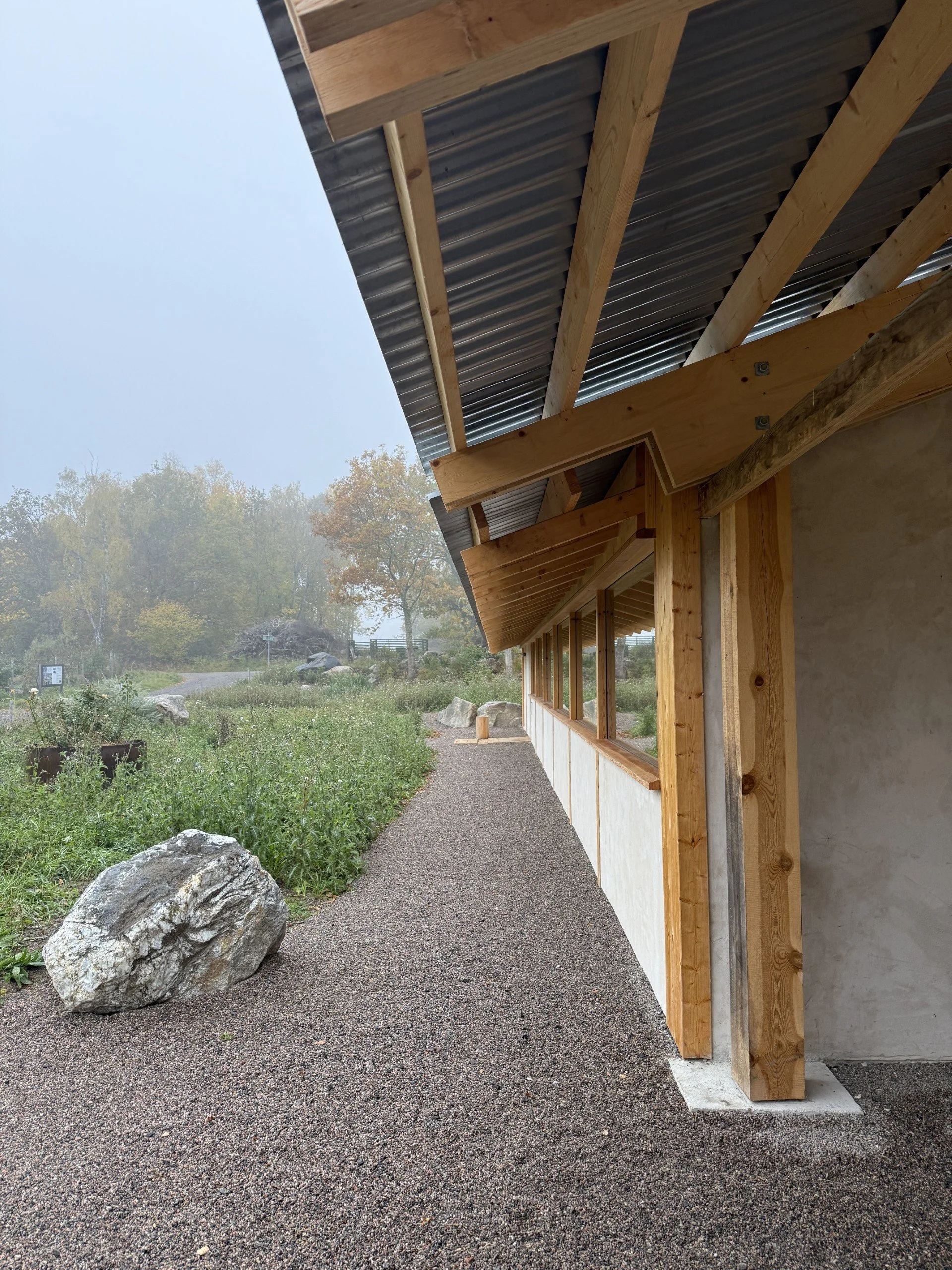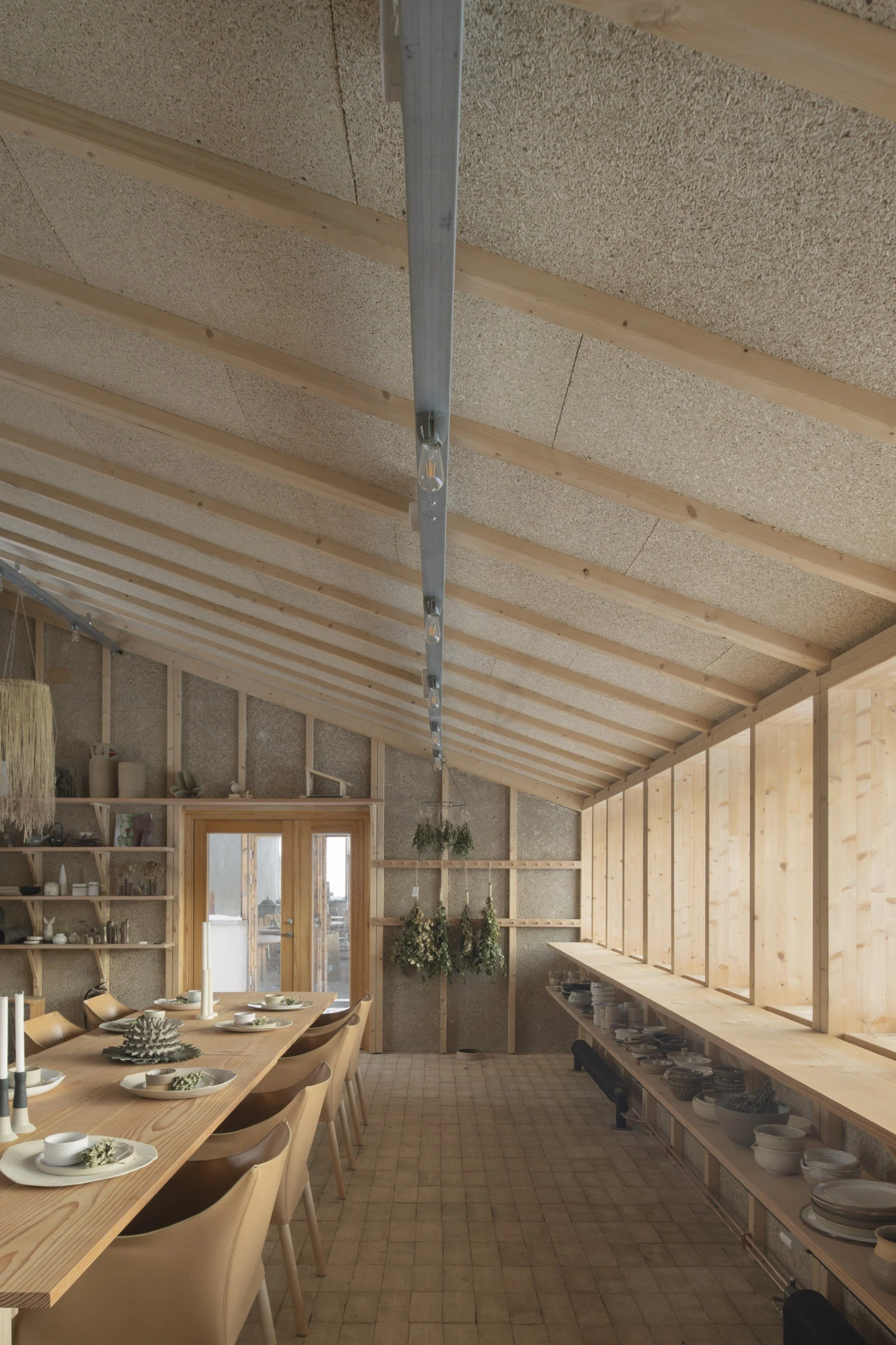 The studio is the primary volume, solid and anchored in the ground. The foundation of recycled foam glass, the glulam frame, and the hemp-lime walls grown in Sweden give the building stability and longevity. The construction is direct and carefully articulated. The orangery is lighter and more open, formed by a more slender timber structure and glass that admits light from several directions. Here the climate and the changing seasons are clearly felt and shape how the space is used.