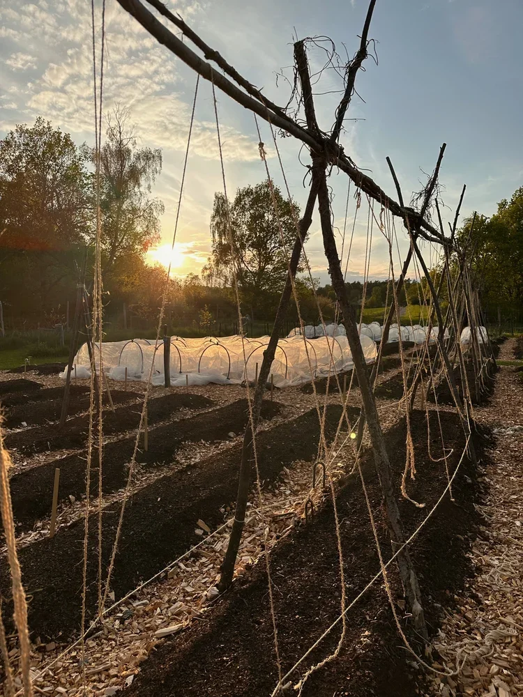 Här finns en framväxande skogsträdgård med olika frukt- och bärsorter, mängder av grönsaker, två växthus, blommor och örter, en damm, bikupor och insekthotell. Besök vår populära farmers market under sommaren mellan juli till september och nya gårdsbutiken med café. Vi förespråkar i huvudsak no dig, en hållbar ekologisk odlingsmetod med kompostlimpor direkt på tänkta odlingsytor, cirka 40 cm höga x 75 cm breda x 7 alternativt 15 m långa med 50 cm mellanrum. Limporna ska helst vara täckta i två säsonger så att allt ogräs försvinner. Kompostmaterialet ska inte blandas med jorden, utan läggas på ytan och vi odlar direkt i den. Komposten minimerar ogräs och fukten bevaras längre i marken. Maskarna sköter grävandet, gödsel berikar och luckrar upp jorden åt oss och vi vill inte störa de mikroorganismer som matar grönsakerna och bygger jordens struktur. Jord är en levande organism, ett eget mycket komplext ekosystem. Vi vill inte bara minska vår belastning på miljön utan även sträva efter att gå bortom hållbarhet mot ett netto positivt avtryck.